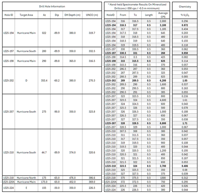 Significantly elevated uranium geochemistry was returned from winter drill holes LE25-194 and LE25-198, as well as summer drill holes LE25-220A and LE25-231, which were drilled on the Hurricane Main Trend east of the deposit. LE25-203, drilled in the winter north of LE25-194, did not intersect significantly elevated radioactivity.