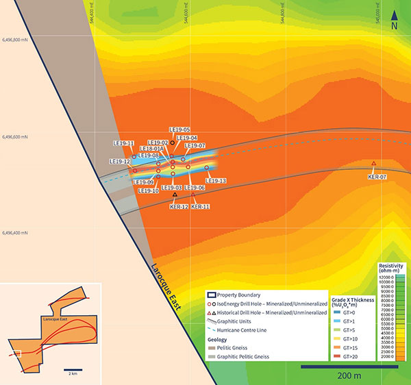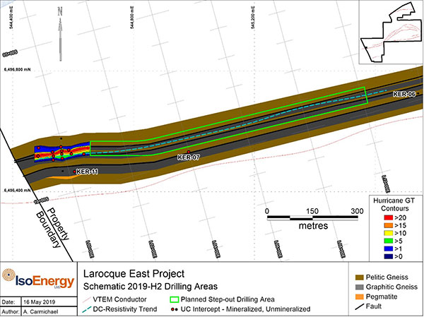 May 29, 2019Vancouver, BC, May 29, 2019 – IsoEnergy Ltd. (“IsoEnergy” or the “Company”) (TSXV: ISO; OTCQX: ISENF) is pleased to announce its targeting strategy for the upcoming Summer 2019 Hurricane Extension drilling program on its 100% owned Larocque East property (the “Property”). The primary objective of the drilling will be to evaluate the potential for expansion of the Hurricane zone east of the current drilling pattern. Targets have been generated from integrated interpretations of geology, trace element geochemistry, alteration patterns and preliminary results from a 53 line-km program of DC-Resistivity (DC-Res) geophysical surveying that is still underway. The Hurricane zone is a new discovery of high-grade uranium mineralization located in the prolific eastern Athabasca basin, Saskatchewan.