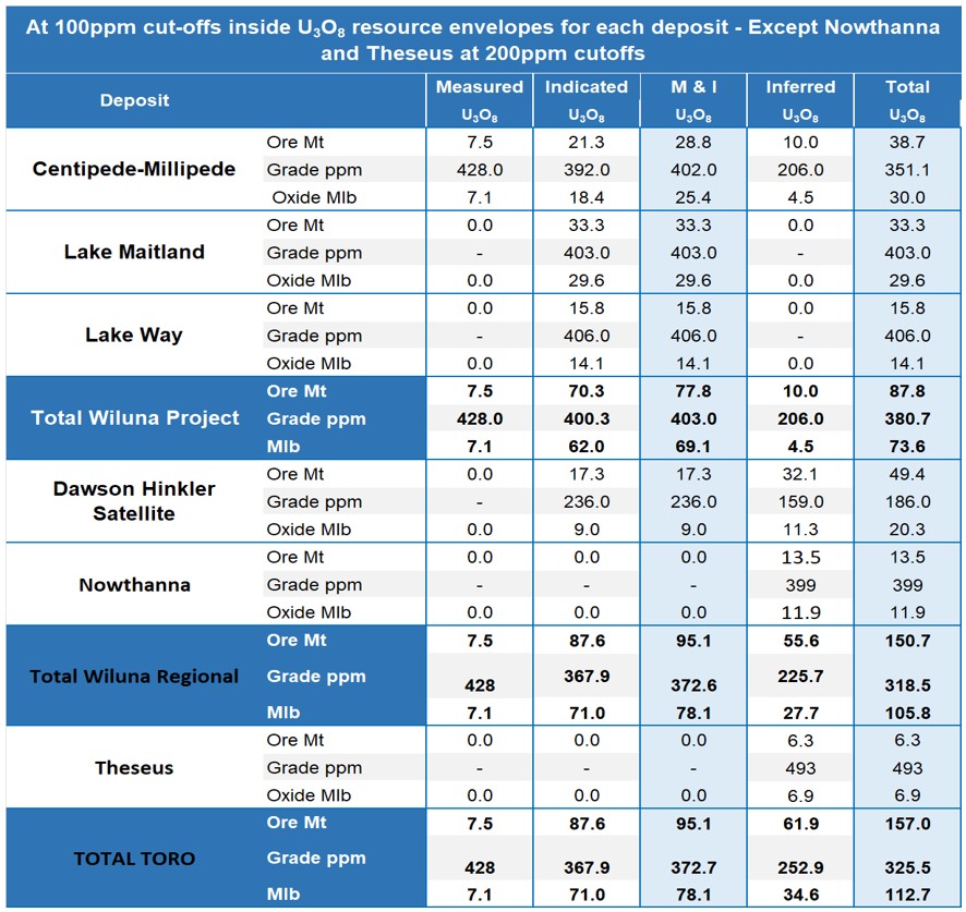 - Based on updated mineral resource estimates for the Wiluna Uranium Project Deposits of Lake Maitland announced by Toro on September 24, 2024 and Centipede-Millipede and Lake Way announced by Toro on March 7, 2024, the Dawson Hinkler Satellite Deposit announced by Toro on May 2, 2024, the Nowthanna Deposit announced by Toro on February 1, 2016 and the Theseus Project, announced by Toro on December 5, 2012, prepared in accordance with JORC Code 2012, except Theseus which is in accordance with JORC Code 2004. Information contained in this announcement in connection with the Theseus Project was prepared and first disclosed under the JORC Code 2004. It has not been updated since to comply with the JORC Code 2012 on the basis that the information has not materially changed since it was last reported. The JORC Table 1 relevant to all of the Toro resource estimates can be found in Toro’s ASX announcement of September 24, 2024 (titled “Significant Expansion Stated Lake Maitland Uranium Resource”, except for Theseus, which is found in Toro’s ASX announcement of December 5, 2012 (titled “Maiden Inferred Uranium Resource for Toro’s Theseus Deposit”). For the purposes of ASX Listing Rule 5.23, Toro confirms that it is not aware of any new information or data that materially affects the information included in those original announcements, and that all material assumptions and technical parameters underpinning the estimates in the original announcements continue to apply and have not materially changed.